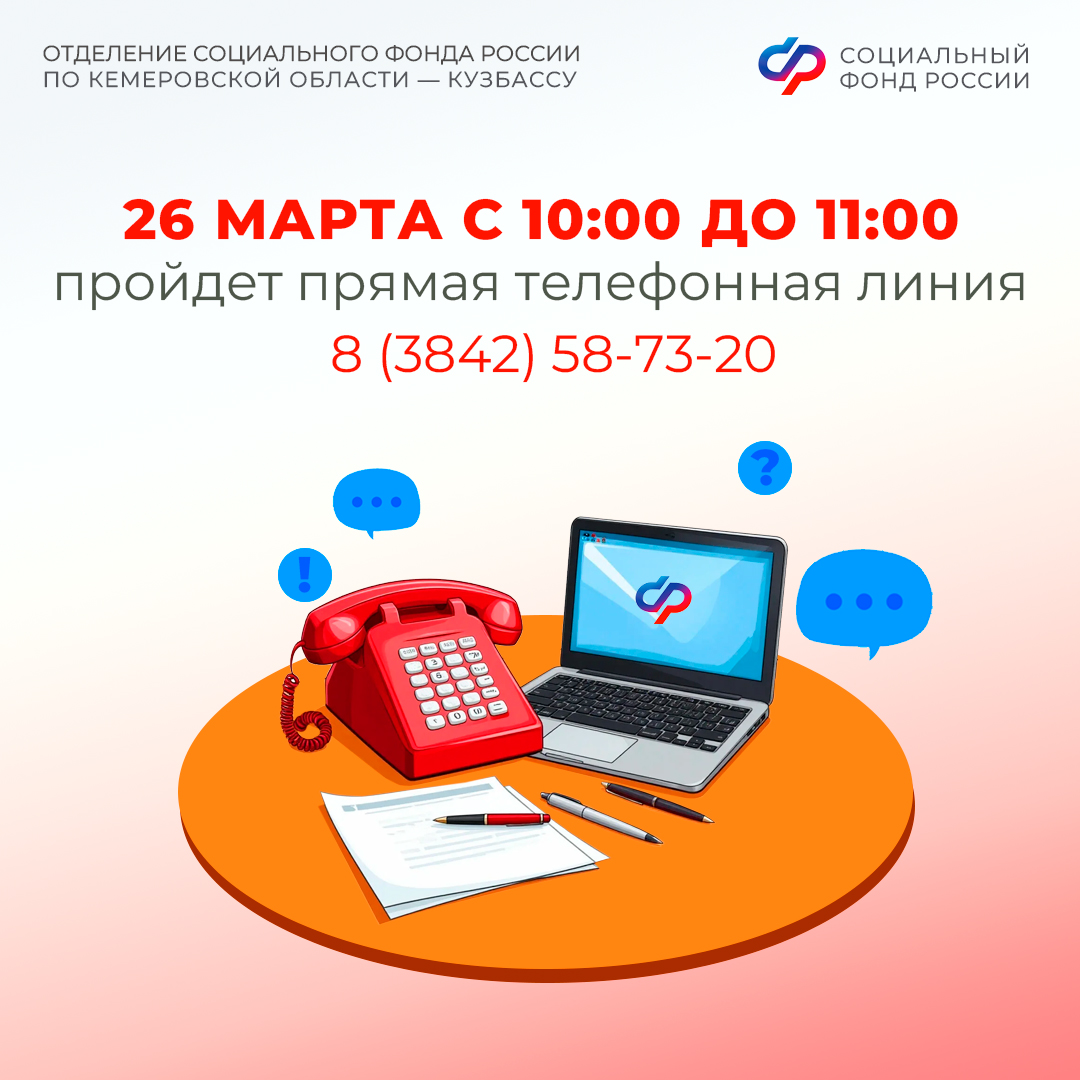26 марта, в четверг, с 10 до 11 часов в Отделении Социального фонда России по Кемеровской области - Кузбассу пройдет телефонная прямая линия.