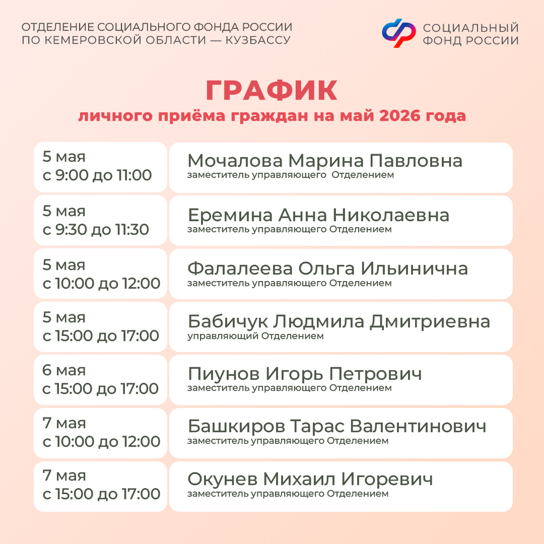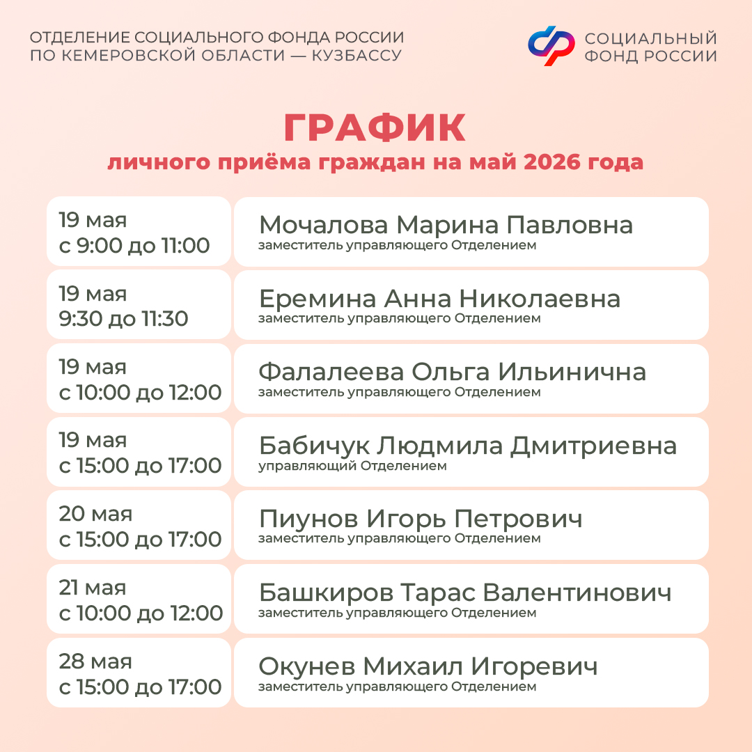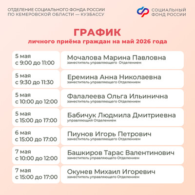 График личного приема граждан руководством Отделения СФР по Кемеровской области – Кузбассу в мае 2026 года смотрите в наших карточках, а также на региональной странице Отделения СФР по Кузбассу.