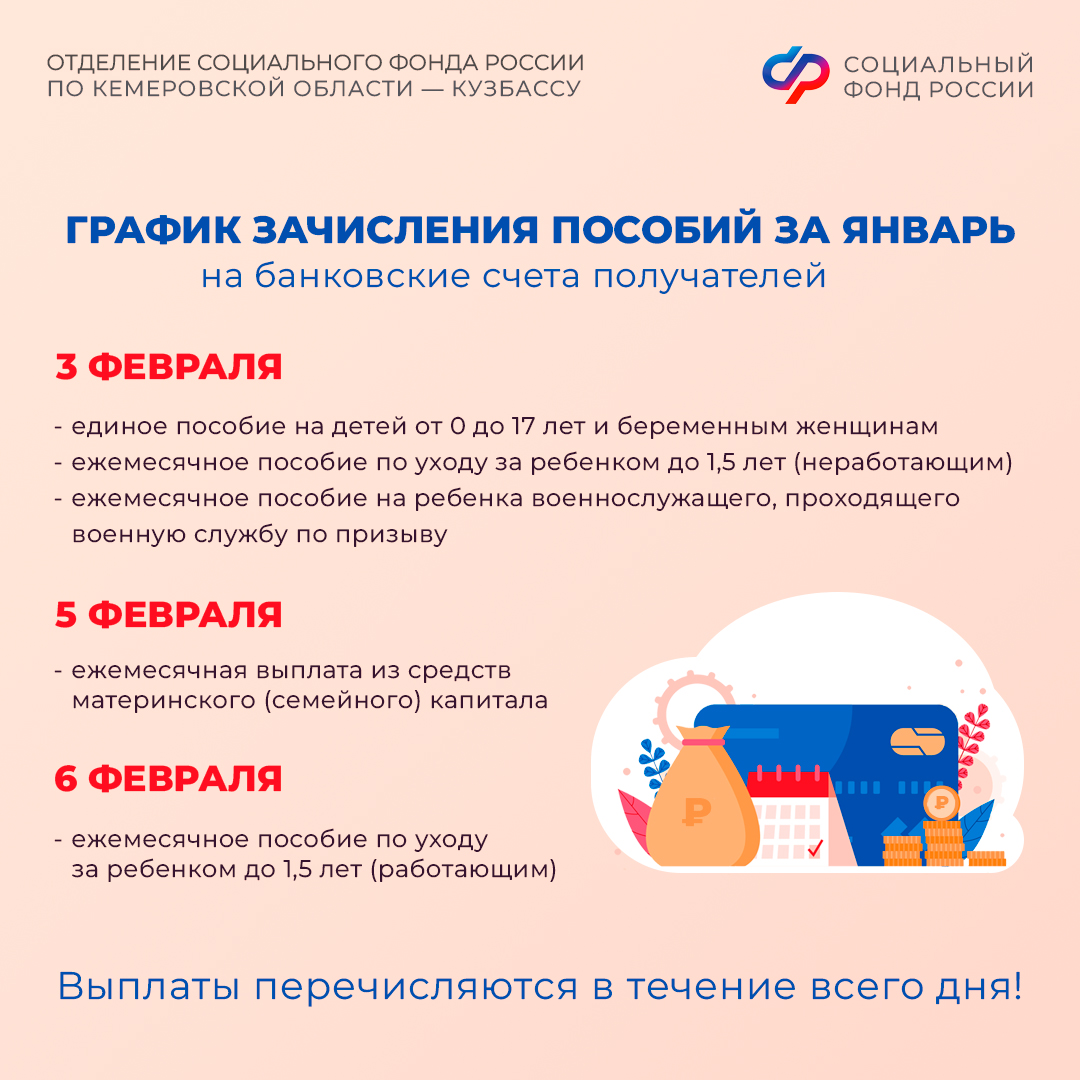 Отделение СФР по Кемеровской области напоминает: выплата пенсий и социальных выплат осуществляется за текущий месяц. Перечисления пособий – в новом месяце за предыдущий, то есть в феврале вы получите пособия за январь.
