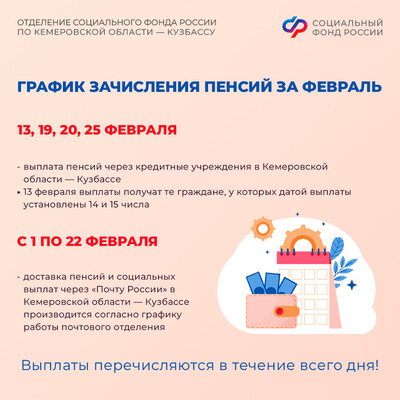 Главная » 2026»Февраль»2 » График выплат пенсий и детских пособий в Кузбассе на февраль