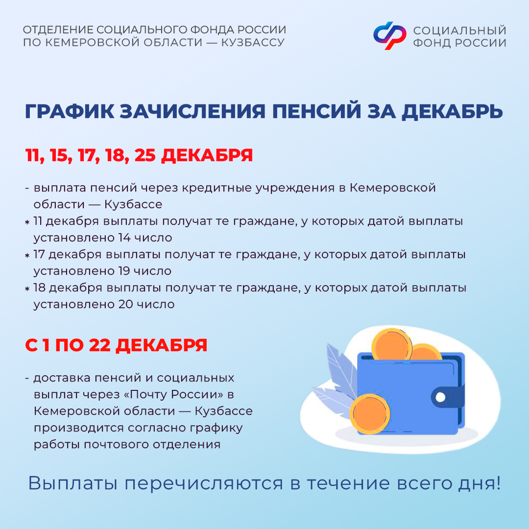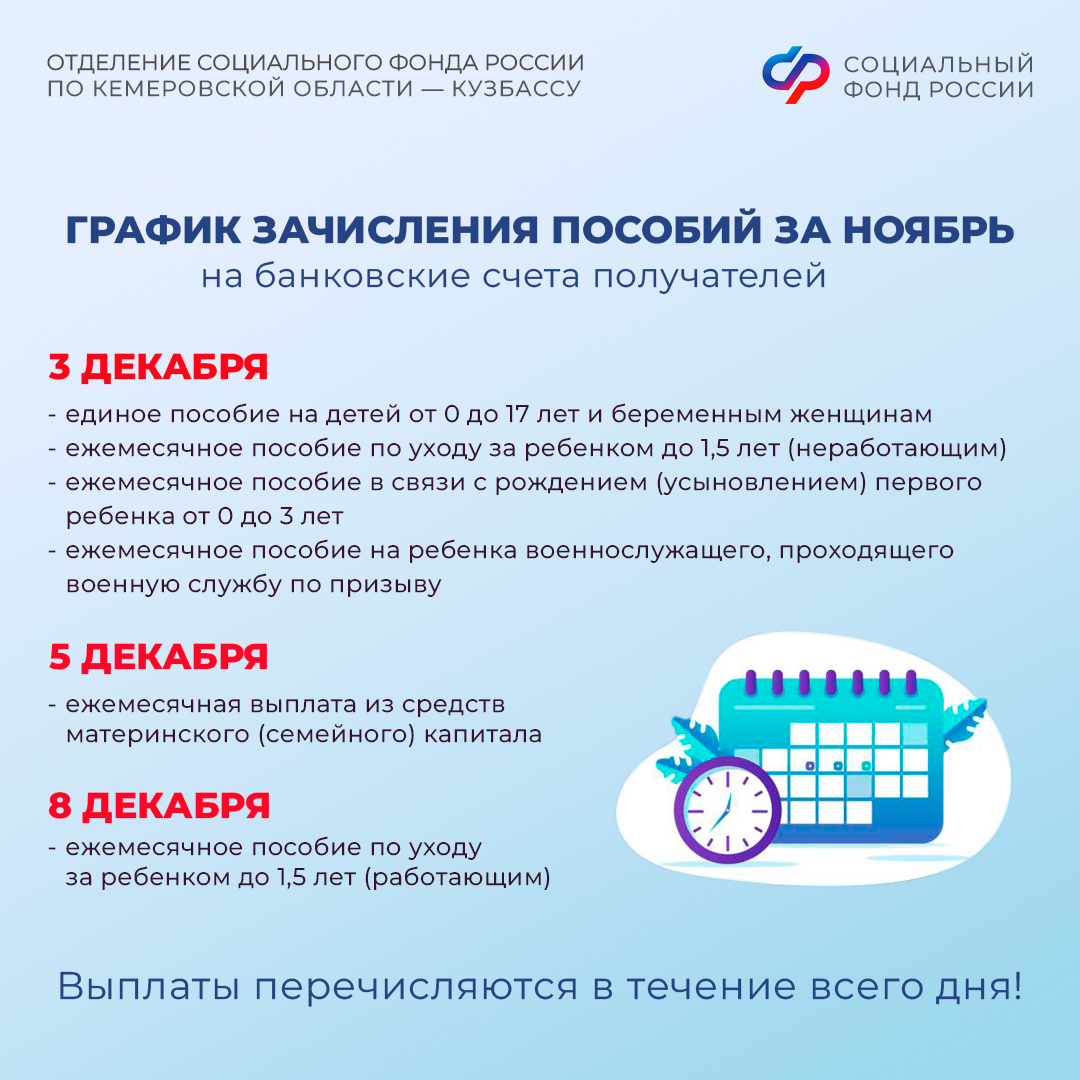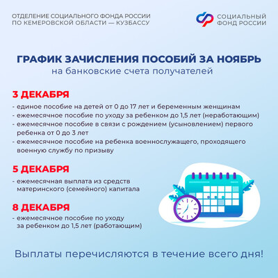 Отделение СФР по Кемеровской области напоминает: перечисление пенсий и социальных выплат осуществляется за текущий месяц, пособий - в новом месяце за предыдущий, то есть в декабре вы получите пособия за ноябрь.