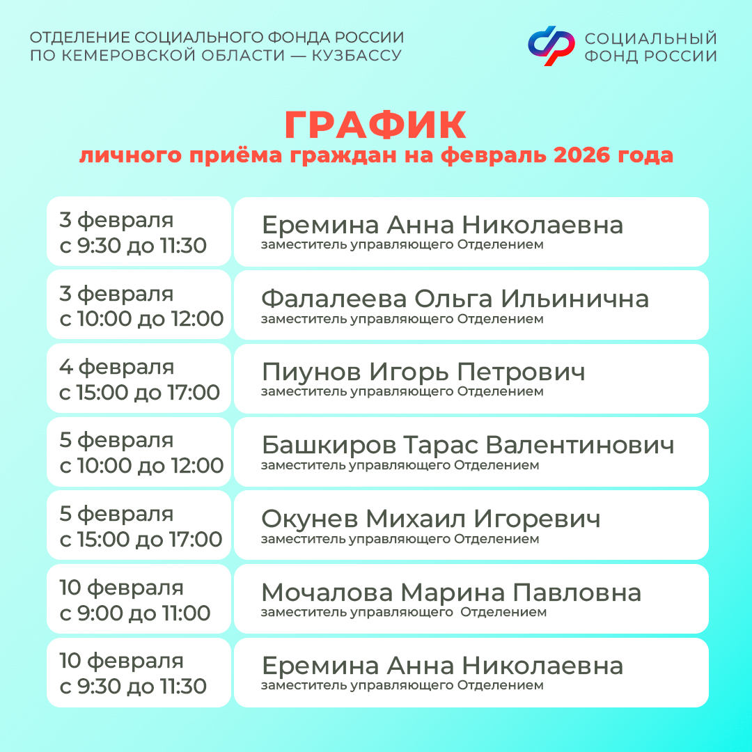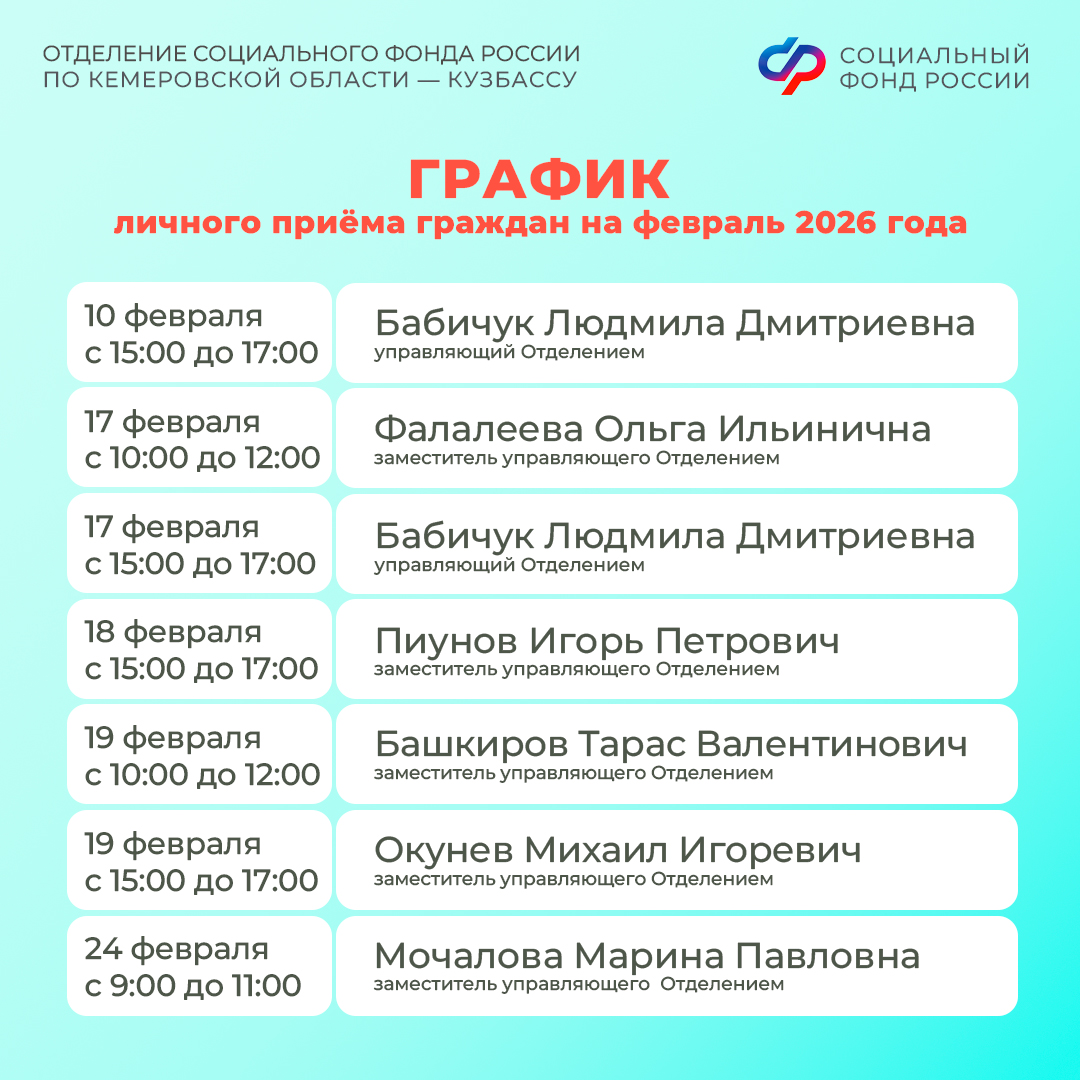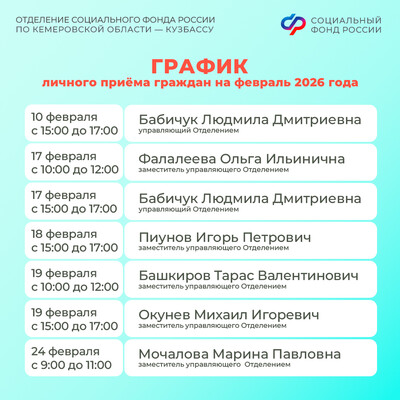 График личного приема граждан руководством Отделения СФР по Кемеровской области – Кузбассу в феврале 2026 года смотрите в наших карточках, а также на региональной странице Отделения СФР по Кузбассу: https://sfr.gov.ru/branches/kuzbass/info/~0/11603?info_category=1